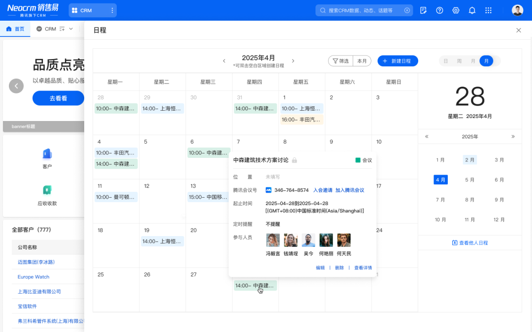 在销售易中预定会议后,系统将自动为不同参会人生成专属会议邀请链接,并自动同步至CRM、腾讯会议与企业微信日程等多平台,不需要在各群里转发艾特。会前的全渠道提醒有效避免遗漏。